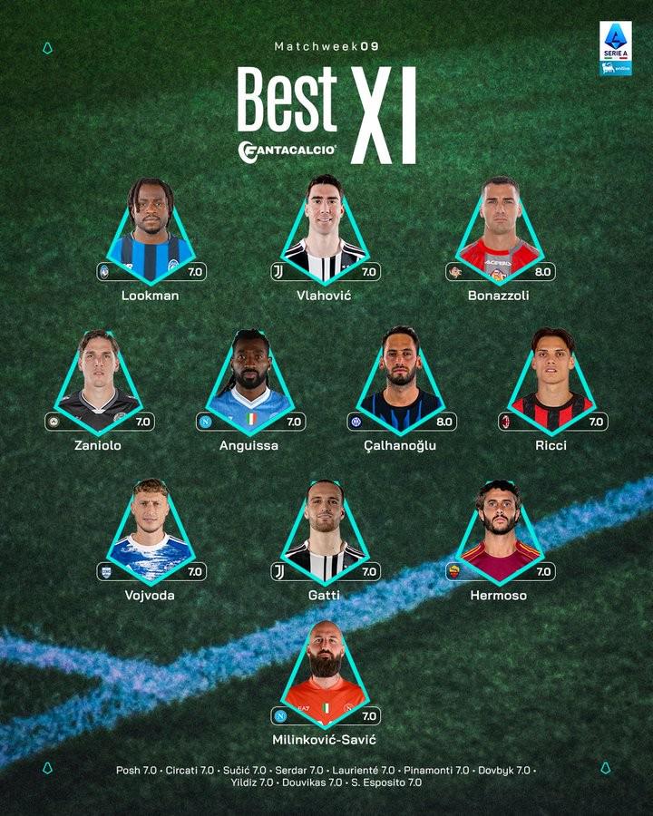 北京时间10月31日,意甲官方公布了联赛第10轮的最佳11人阵容沪深配,、弗拉霍维奇、扎尼奥洛、恰尔汗奥卢、萨穆埃莱-里奇、费代里科-加蒂以及埃尔莫索入选。
